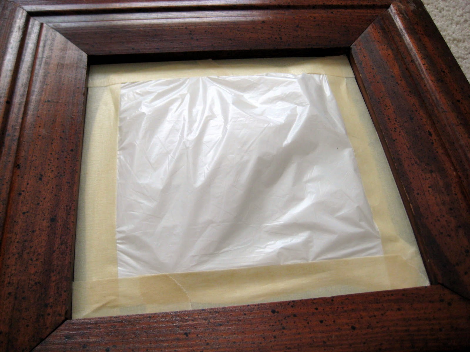 After forking over the <$2, we took it home. I cleaned up the wood and taped up the mirror with a cut up grocery bag and masking tape.